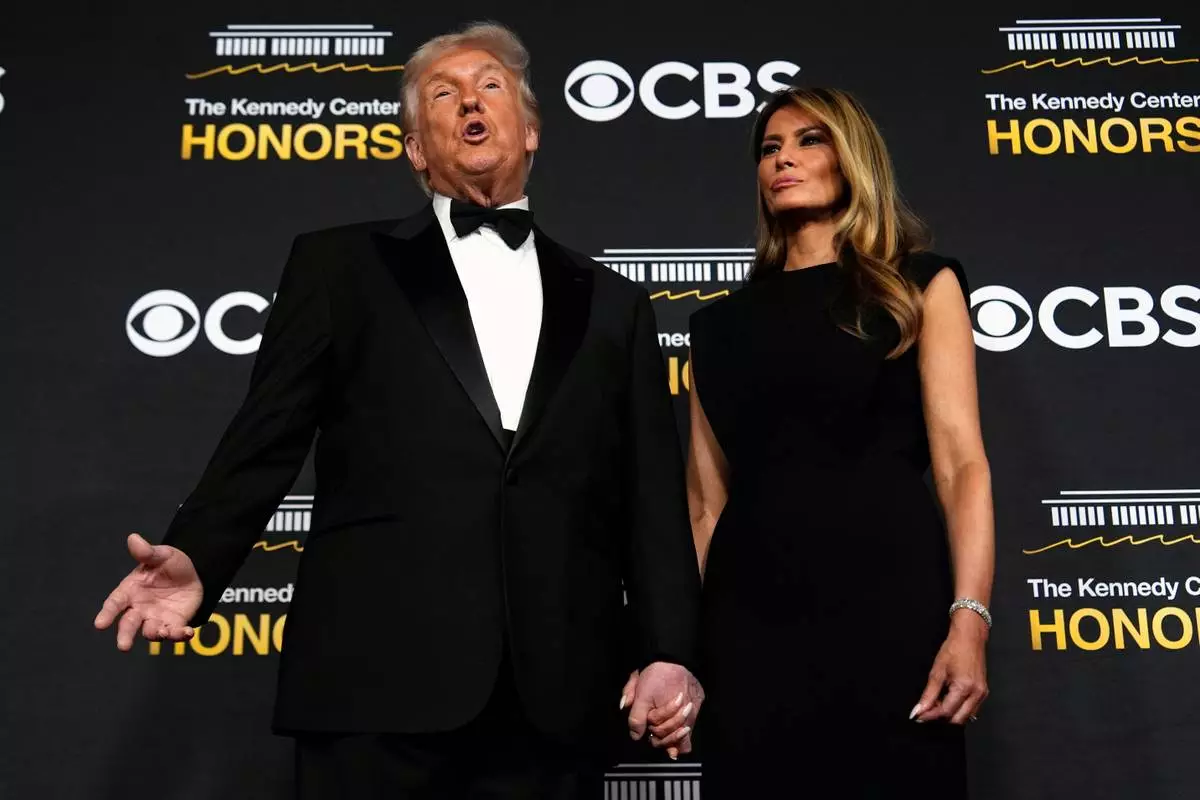 President Donald Trump and first lady Melania Trump, walk the red carpet before the 48th Kennedy Center Honors, Sunday, Dec. 7, 2025, at the John F. Kennedy Center for the Performing Arts in Washington. (AP Photo/Julia Demaree Nikhinson)