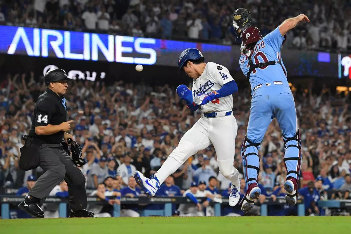 Los Angeles Dodgers' Hyeseong Kim, center, scores the game-winning run past Philadelphia Phillies catcher J.T. Realmuto (10) on a ground ball by Andy Pages and a throwing error by Phillies pitcher Orion Kerkering during the eleventh inning in Game 4 of baseball's National League Division Series Thursday, Oct. 9, 2025, in Los Angeles. (AP Photo/Mark J. Terrill)