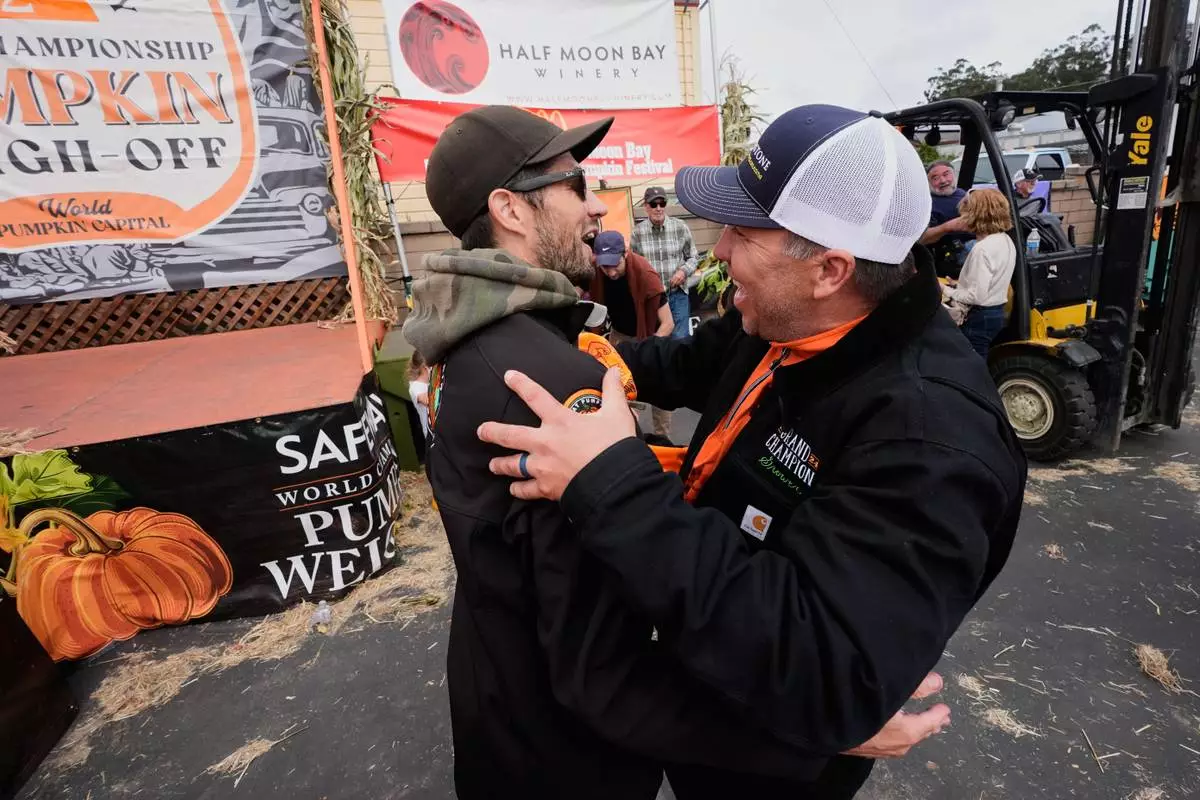 Brandon Dawson, left, celebrates after winning the Safeway 52nd annual World Championship Pumpkin Weigh-Off in Half Moon Bay, Calif., Monday, Oct. 13, 2025. (AP Photo/Godofredo A. Vásquez)