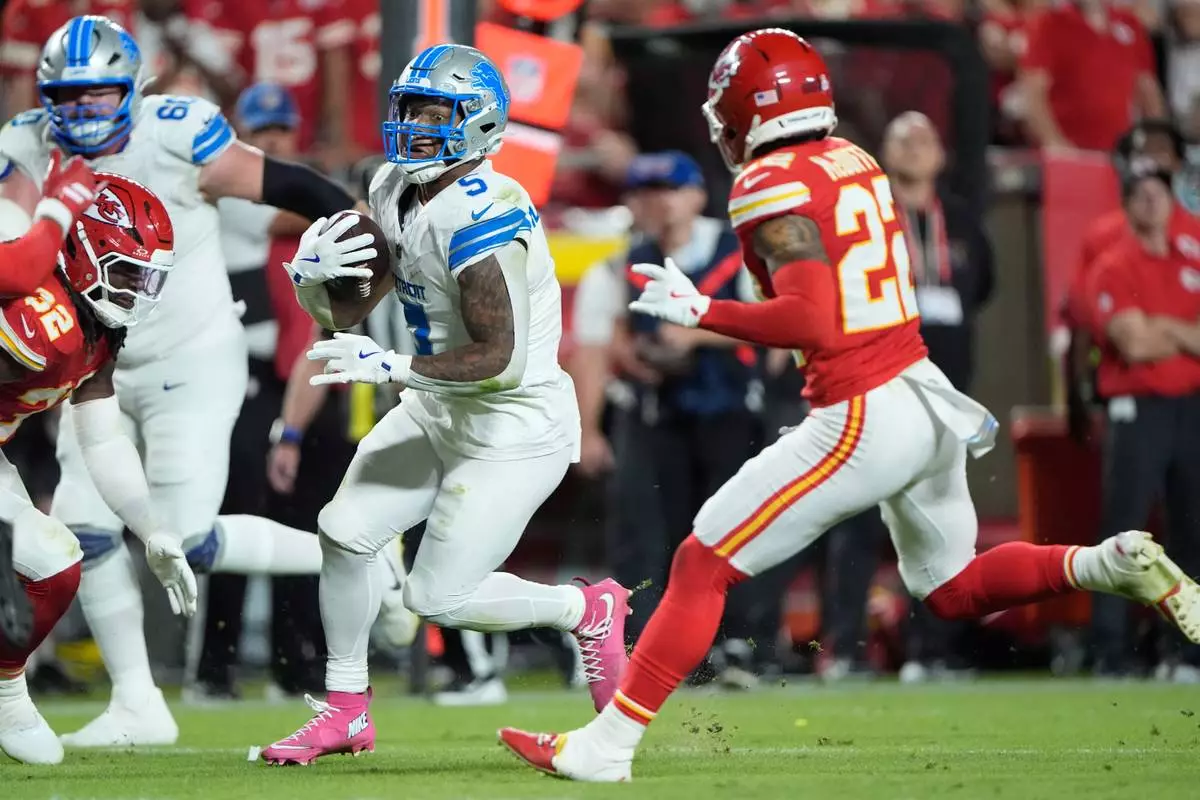 Jahmyr Gibbs was held in check by the Kansas City defense, finishing with 18 touches — 17 rushes and one reception — for just 65 total yards.