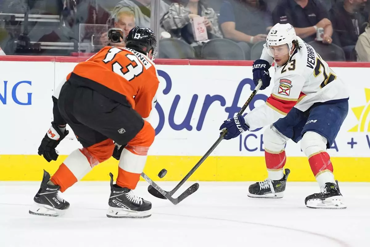 Florida Panthers' Carter Verhaeghe, right, passes the puck past Philadelphia Flyers' Adam Ginning, left, during the first period of an NHL hockey game, Monday, Oct. 13, 2025, in Philadelphia. (AP Photo/Matt Rourke)