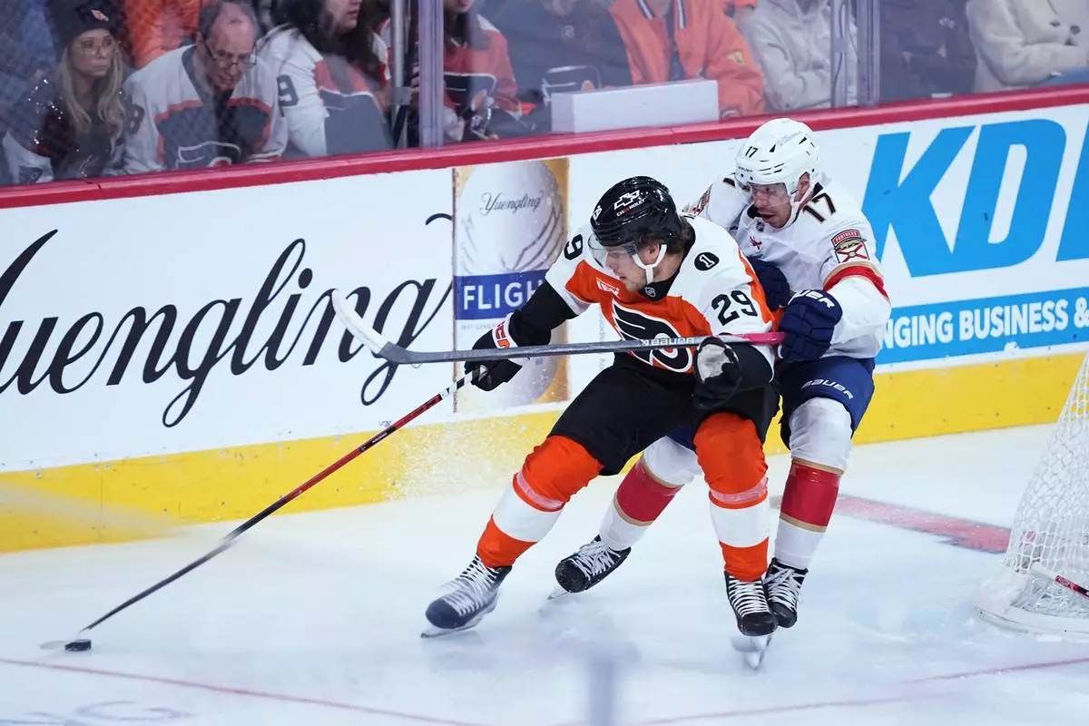 Florida Panthers center Anton Lundell, left, and Philadelphia Flyers right wing Bobby Brink, right, vie for the puck during the first period of an NHL hockey game, Monday, Oct. 13, 2025, in Philadelphia. (AP Photo/Matt Rourke)