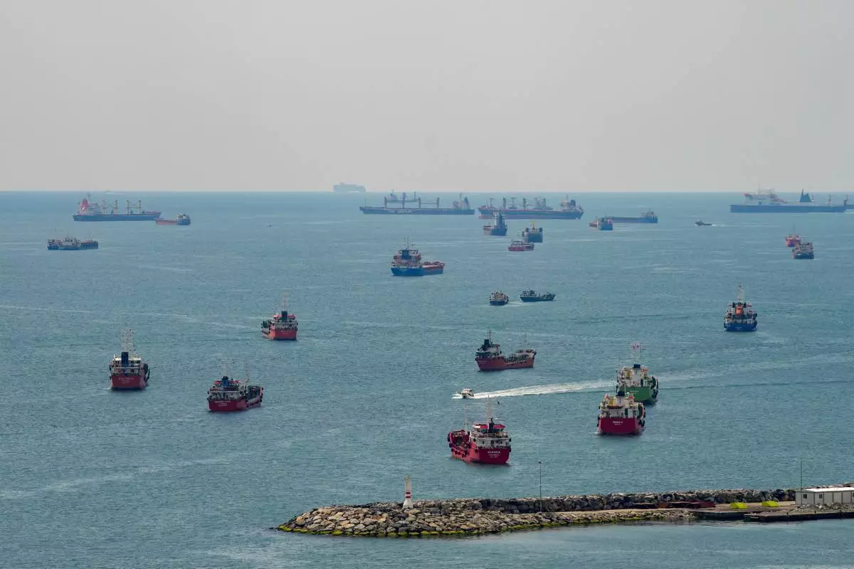 FILE - Cargo ships are anchored in the Sea of Marmara as they await to cross the Bosphorus, in Istanbul, Turkey, April 13, 2025. (AP Photo/Emrah Gurel, File)