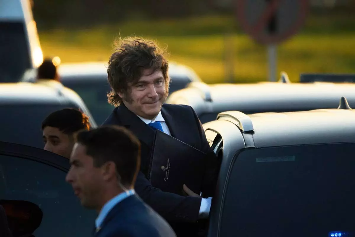 Argentina's President Javier Milei arrives at Ezeiza Prison Complex to present a draft reform of the criminal code to be sent to the Congress in Ezeiza, Argentina, Thursday, Oct. 2, 2025. (AP Photo/Rodrigo Abd)
