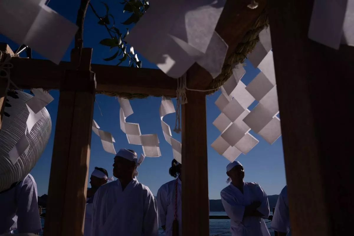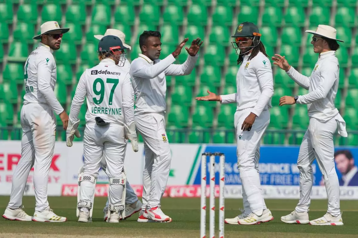 South Africa's Senuran Muthusamy, center, celebrates with teammates after taking the wicket of Pakistan's Abdullah Shafique during the third day of the first test cricket match between Pakistan and South Africa, in Lahore, Pakistan, Tuesday, Oct. 14, 2025. (AP Photo/K.M. Chaudary)