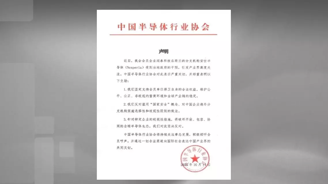 According to the association, the intervention by Dutch government against Nexperia, a CSIA member comany, has drawn significant attention from China's semiconductor industry.