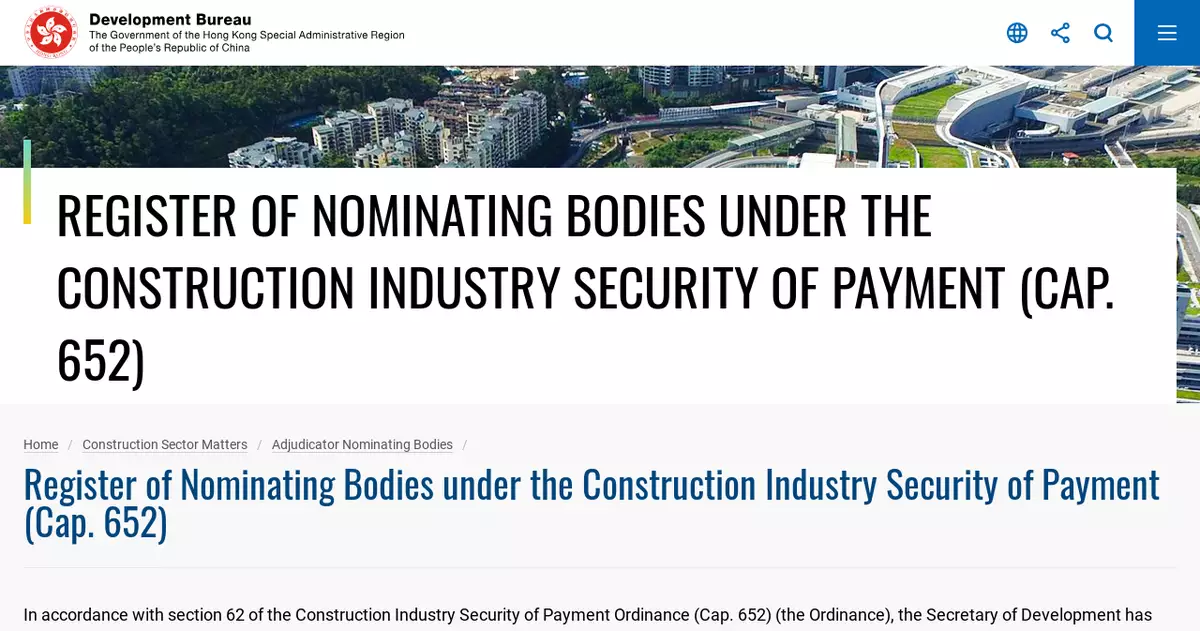 The Development Bureau (DEVB) today (October 14) announced that it has established a register of adjudicator nominating bodies in accordance with the Construction Industry Payment Security Ordinance (Cap. 652). The register has been published on the DEVB website (www.devb.gov.hk/en/construction_sector_matters/adjudicator-nominating-bodies/under-ordinance-cap-652/index.html).
