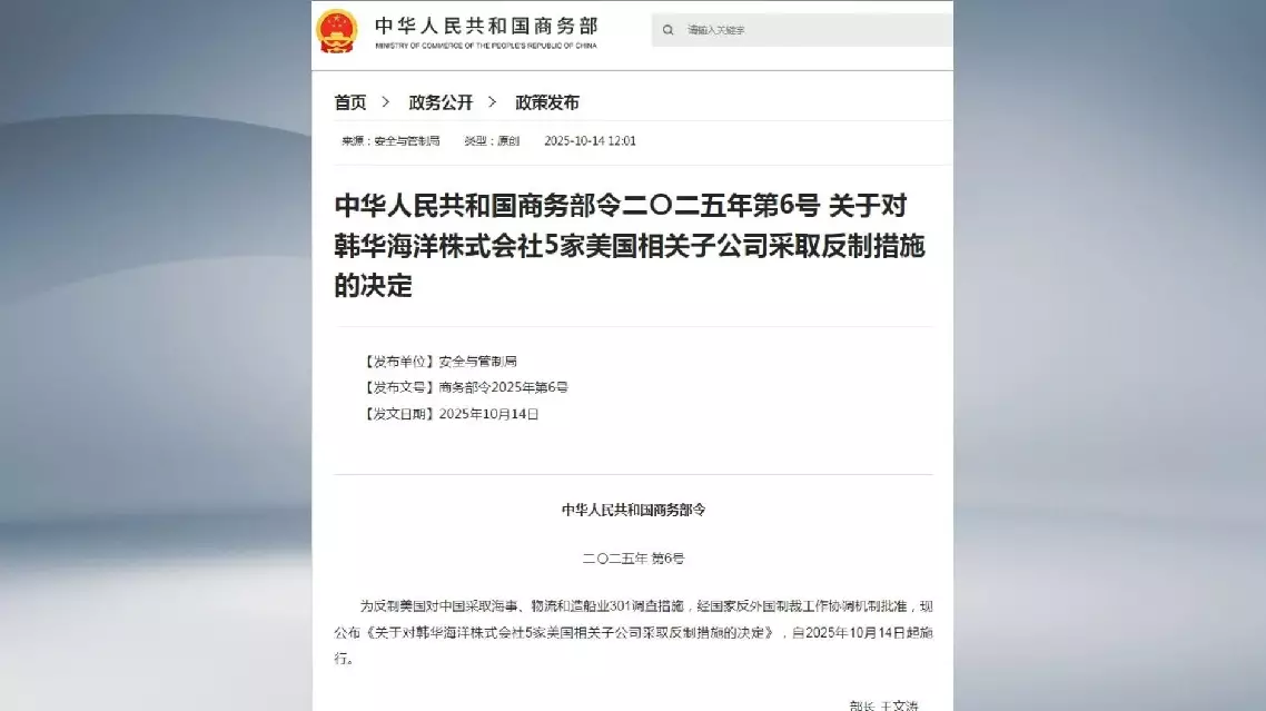 China's Ministry of Commerce on Tuesday announced the decision to take countermeasures against five U.S.-linked subsidiaries of Hanwha Ocean, a leading shipbuilding enterprise from the Republic of Korea.