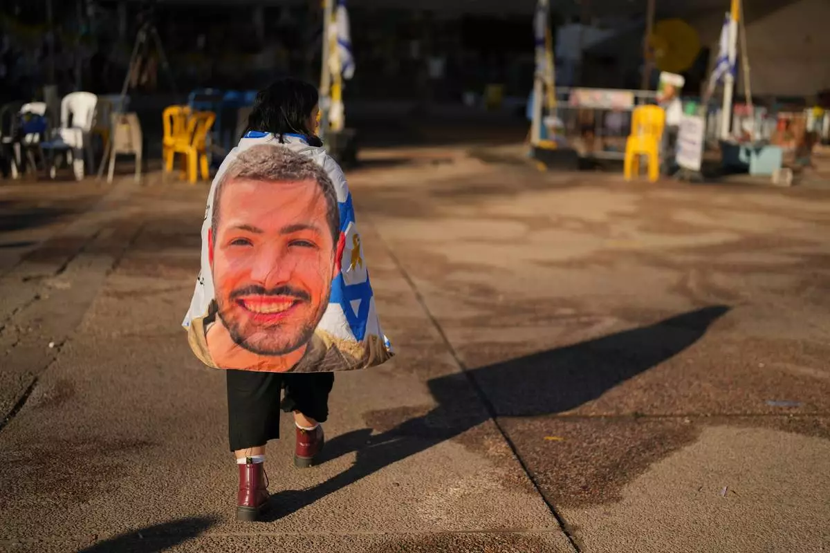 Israeli Yaar, only first name given, walks wrapped with an Israeli flag with the photo of one of her best friend Itay Chen, who was killed in Hamas' attack on Oct. 7, at the plaza known as hostages square, in Tel Aviv, Israel, Tuesday, Oct. 14, 2025. (AP Photo/Francisco Seco)