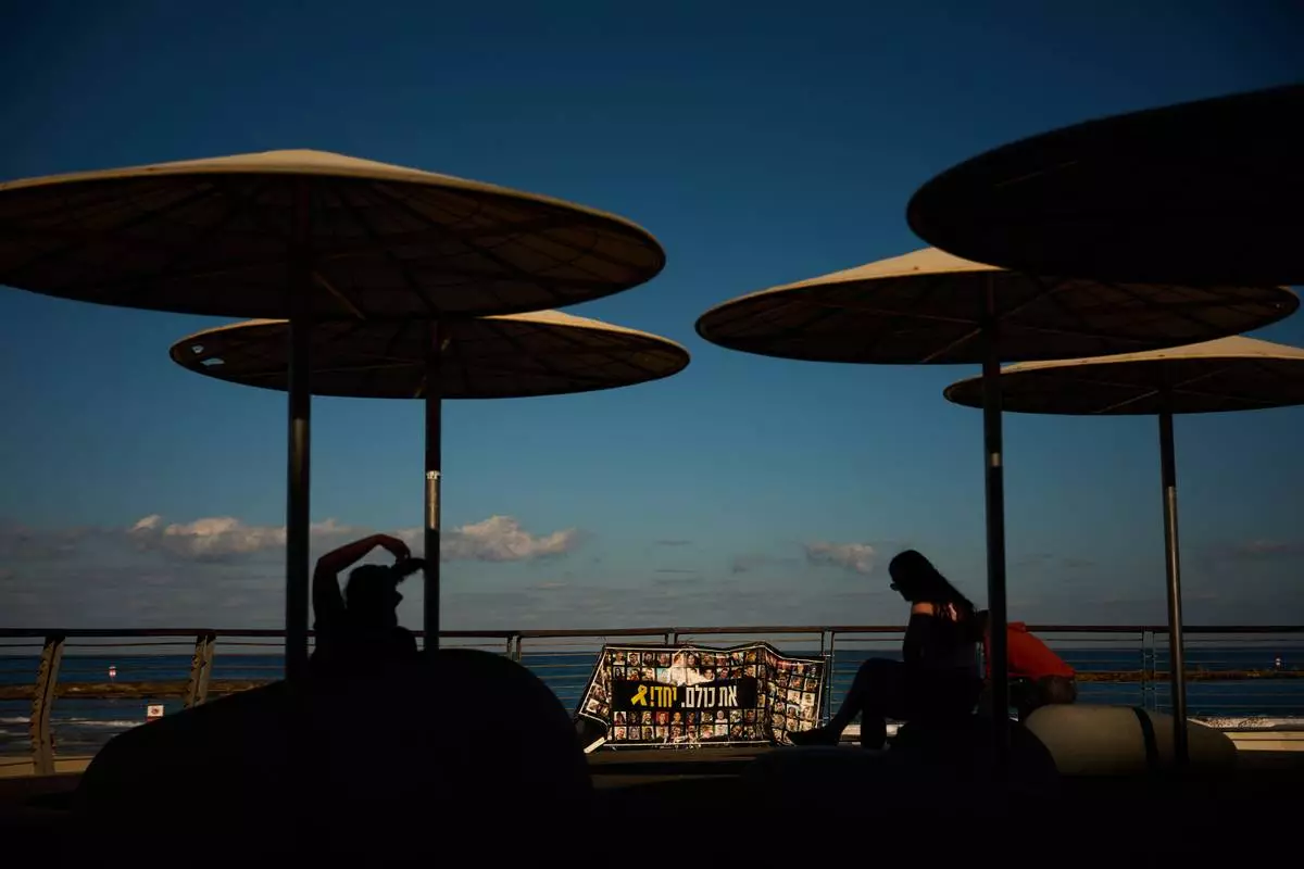 People sit in front of the sea alongside photographs of hostages who were held by Hamas in the Gaza Strip, in Tel Aviv, Israel, Tuesday, Oct. 14, 2025. (AP Photo/Emilio Morenatti)