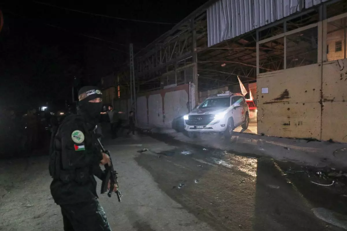 A gunman wearing the uniform of the al-Qassam Brigades, the military wing of Hamas, stands guard as Red Cross vehicles allegedly transporting coffins containing the bodies of four deceased hostages leave a warehouse for Israel, in Gaza City, Tuesday, Oct. 14, 2025. (AP Photo/Yousef Al Zanoun)