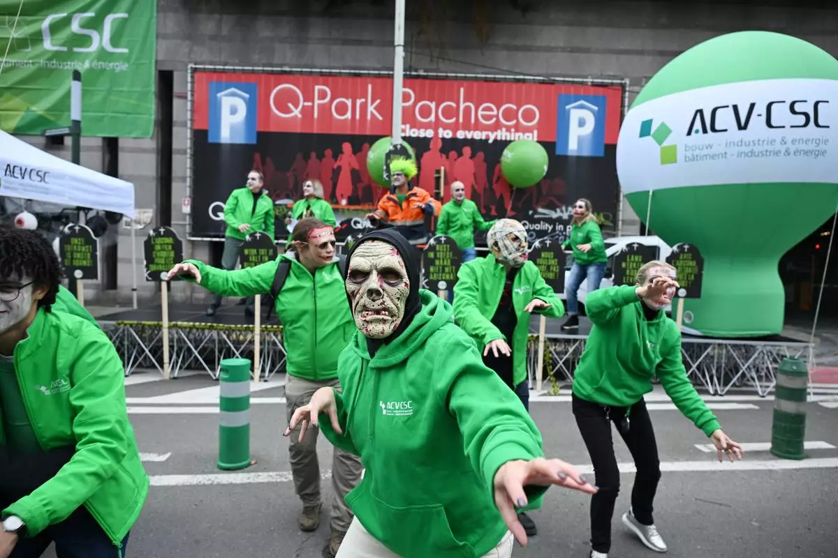 People dressed as zombies march during a demonstration and general strike in Brussels, Tuesday, Oct. 14, 2025. (AP Photo/Harry Nakos)