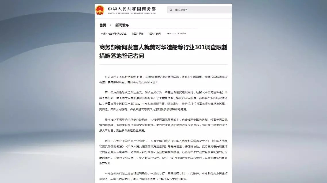 These actions grant unfair competitive advantages to shipping and shipbuilding enterprises from relevant countries, constituting discriminatory practices against China's shipping and shipbuilding industries and severely harming the interests of China's relevant industries, said the spokesperson.