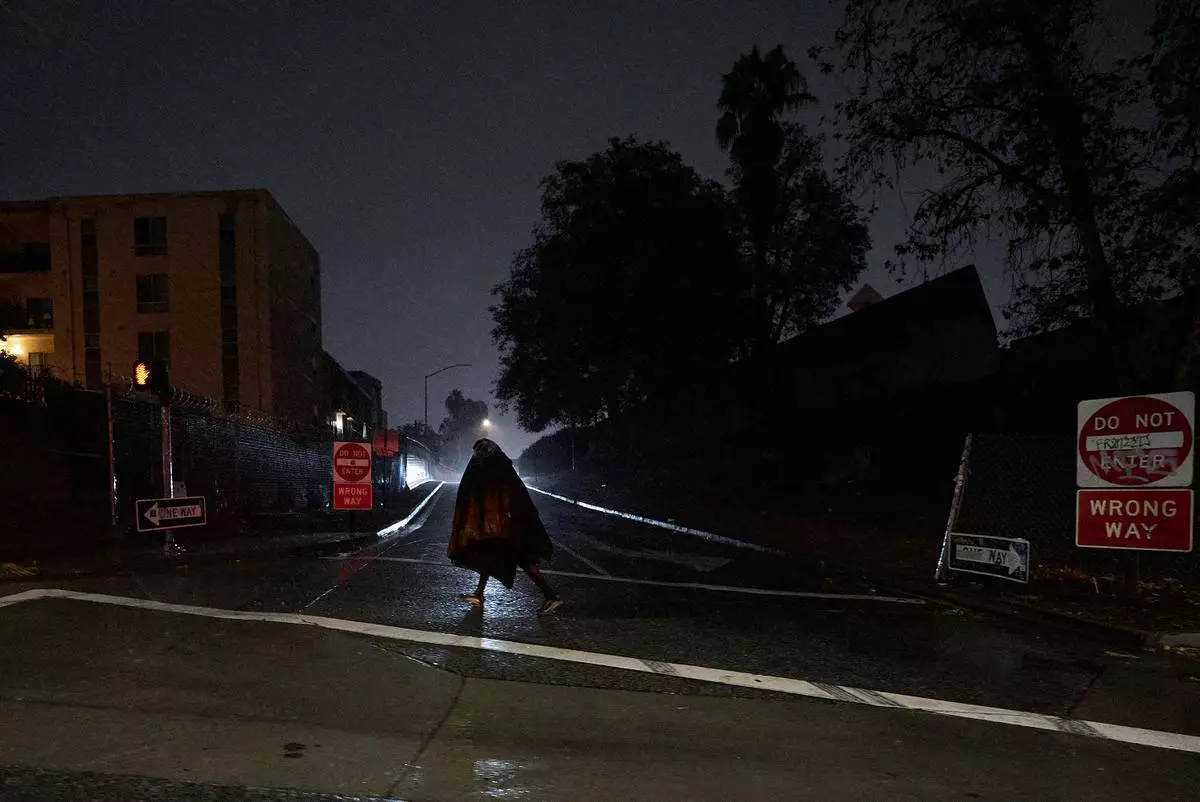 A homeless person walks under gusty showers in East Los Angeles early morning Tuesday, Oct. 14, 2025. (AP Photo/Damian Dovarganes)