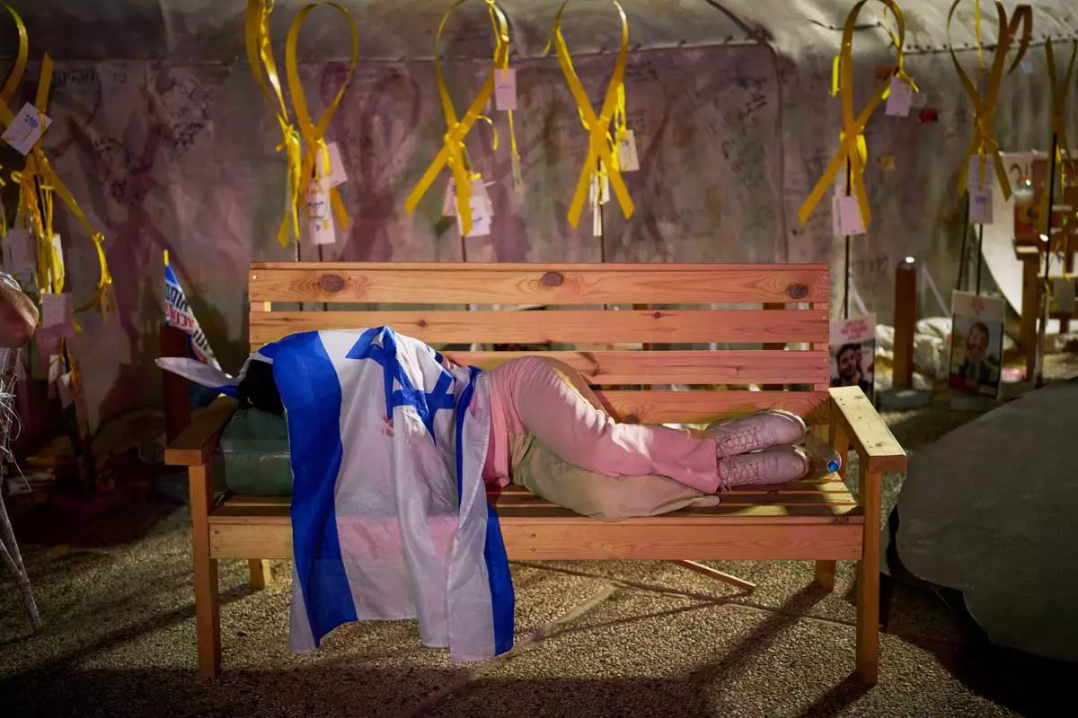 A woman with an Israeli flag draped over her body, sleeps on a bench in "Hostage Square" in Tel Aviv, Israel, on Tuesday, Oct. 14, 2025. (AP Photo/Emilio Morenatti)