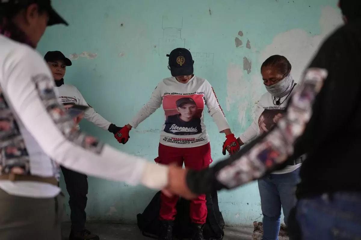 Relatives of missing people, part of a group called the Guerreros Buscadores, pray before inspecting an area where they suspect bodies may be buried, in the Valle de los Olivos neighborhood of Guadalajara, Mexico, Tuesday, Oct. 14, 2025. (AP Photo/Eduardo Verdugo)
