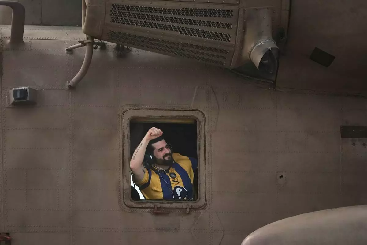 Ziv Berman, an Israeli hostage released from the Gaza Strip gestures from the window of a helicopter landing at the Sheba Medical Center in Ramat Gan, Israel, Monday, Oct. 13, 2025. (AP Photo/Leo Correa)