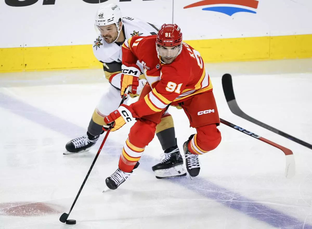 Vegas Golden Knights' Tomas Hertl, left, chases Calgary Flames' Nazem Kadri during third period NHL hockey action in Calgary on Tuesday, Oct. 14, 2025. (Jeff McIntosh/The Canadian Press via AP)