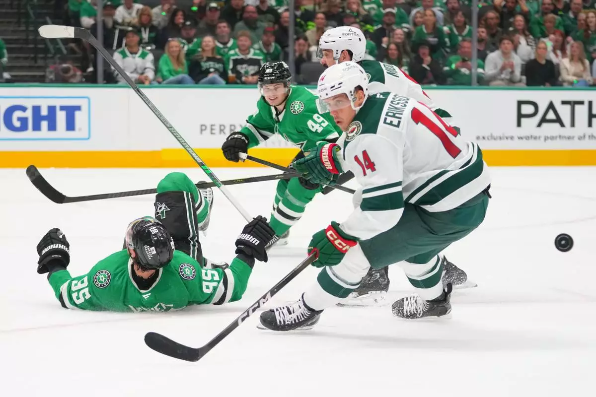 Dallas Stars center Matt Duchene (95) hits the ice while attacking against Minnesota Wild center Joel Eriksson Ek (14) and defenseman Jake Middleton, back right, during the first period of an NHL hockey game Tuesday, Oct. 14, 2025, in Dallas. (AP Photo/Julio Cortez)