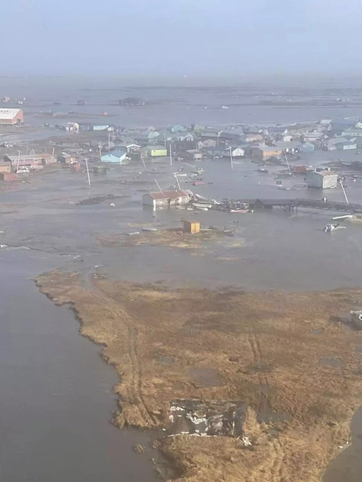 In this photo provided by the U.S. Coast Guard, Kipnuk, Alaska, experiences coastal flooding, Sunday, Oct. 12, 2025. (U.S. Coast Guard via AP)