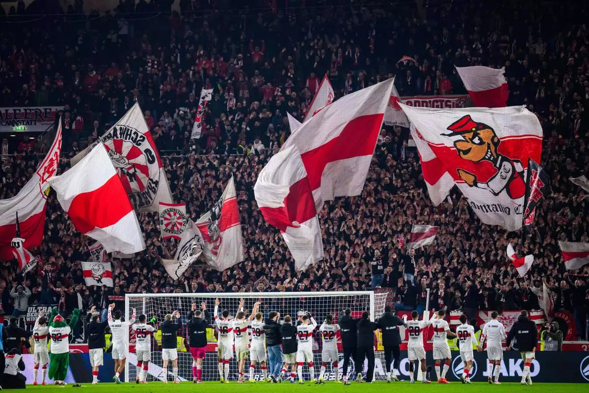 Stuttgart players celebrate with their fans after the Bundesliga soccer match between VfB Stuttgart and Eintracht Frankfurt in Stuttgart, Germany, Tuesday Jan. 13, 2026. (Tom Weller/dpa via AP)