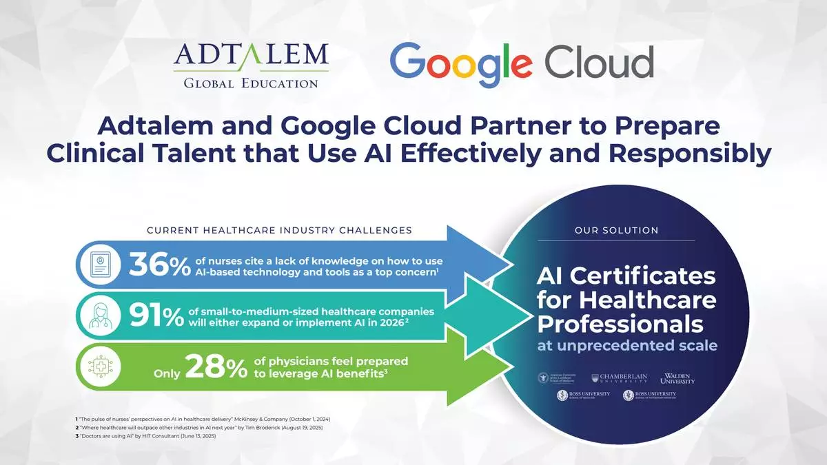 Adtalem Global Education Inc. (NYSE: ATGE), the nation's largest healthcare educator, today announced the launch of the first comprehensive AI credentials program that will be designed specifically for healthcare professionals at scale, reaching students and practicing clinicians across its institutions and partner health systems. Through a strategic partnership with Google Cloud, Adtalem will deliver curriculum powered by Google Cloud's industry-leading AI technology, providing students with direct, hands-on experience with tools reshaping clinical practice.
