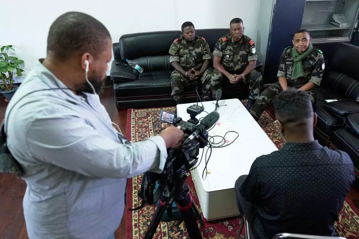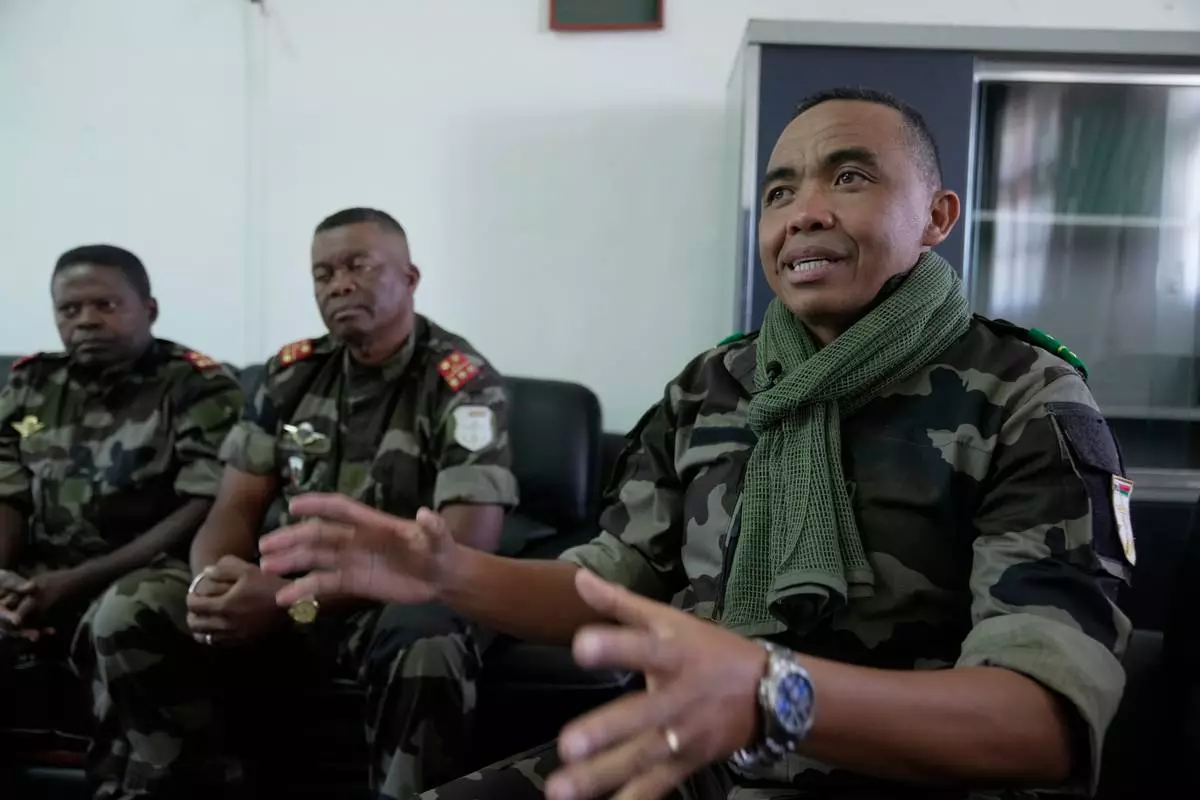 CAPSAT military unit commander Col. Michael Randrianirina, right, speaks during an interview with the Associated Press at the CAPSAT military barracks in Antananarivo, Madagascar, Wednesday, Oct. 15, 2025. (AP Photo/Brian Inganga)