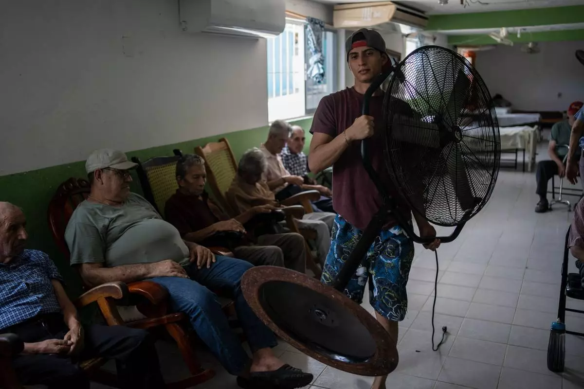 FILE - Humanitarian worker Roger Duvan Lagunes carries a fan into Cogra, an elderly shelter, in Veracruz, Mexico, on June 16, 2024. (AP Photo/Felix Marquez)