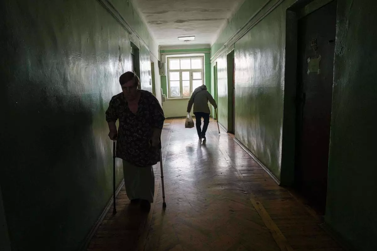 Elderly women walk in a corridor at a hostel for the displaced in Dnipro, Ukraine, Wednesday, Oct. 8, 2025. (AP Photo/Evgeniy Maloletka)