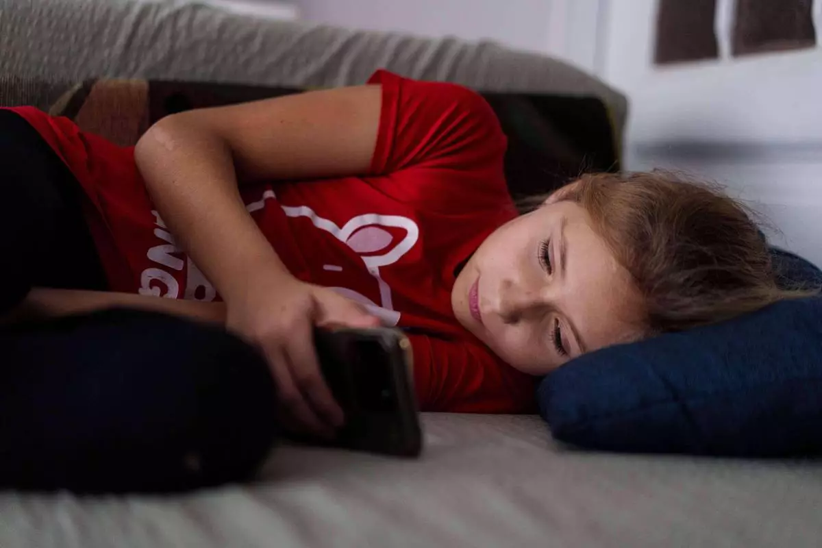 A girl watches videos at a hostel for the displaced in Dnipro, Ukraine, Wednesday, Oct. 8, 2025. (AP Photo/Evgeniy Maloletka)