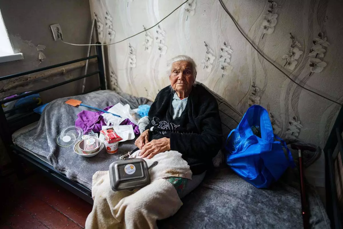 Valentina Khusak, 86, sits in her room at a hostel for displaced persons in Dnipro, Ukraine, Wednesday, Oct. 8, 2025. (AP Photo/Evgeniy Maloletka)