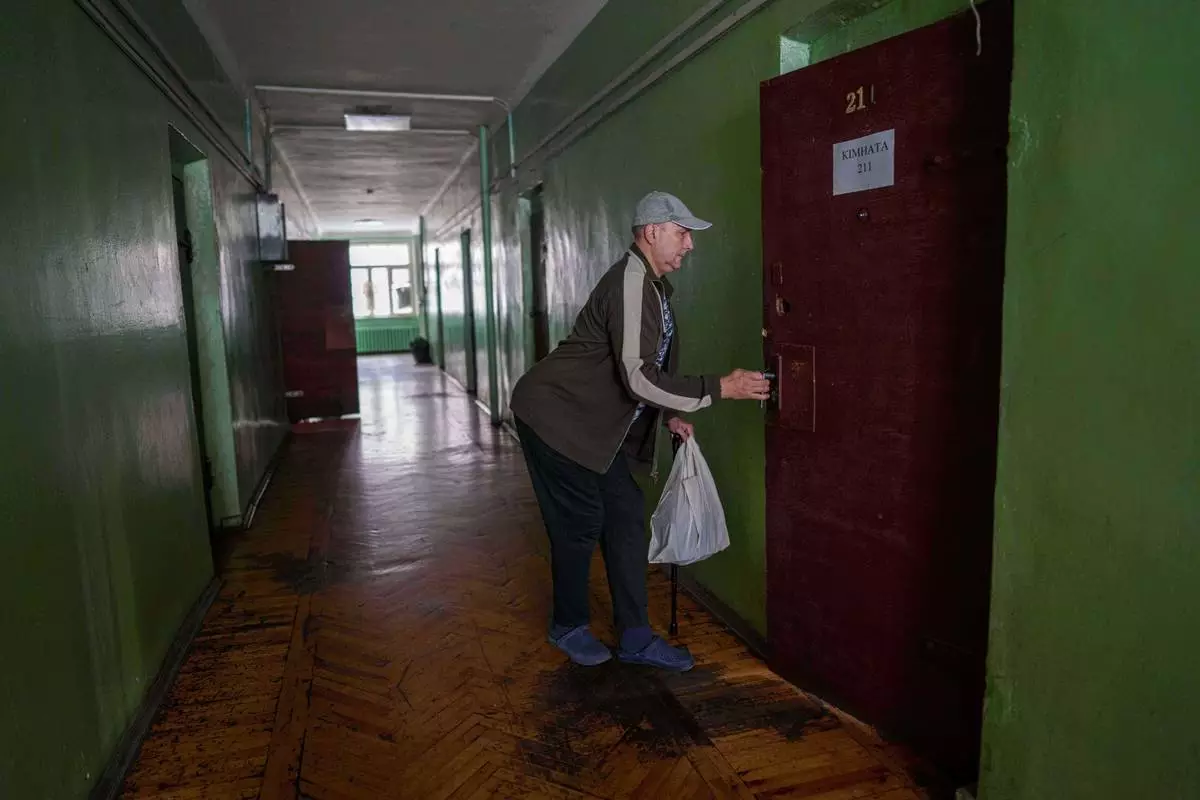 A man using a cane walks into his room at a hostel for the displaced in Dnipro, Ukraine, Wednesday, Oct. 8, 2025. (AP Photo/Evgeniy Maloletka)