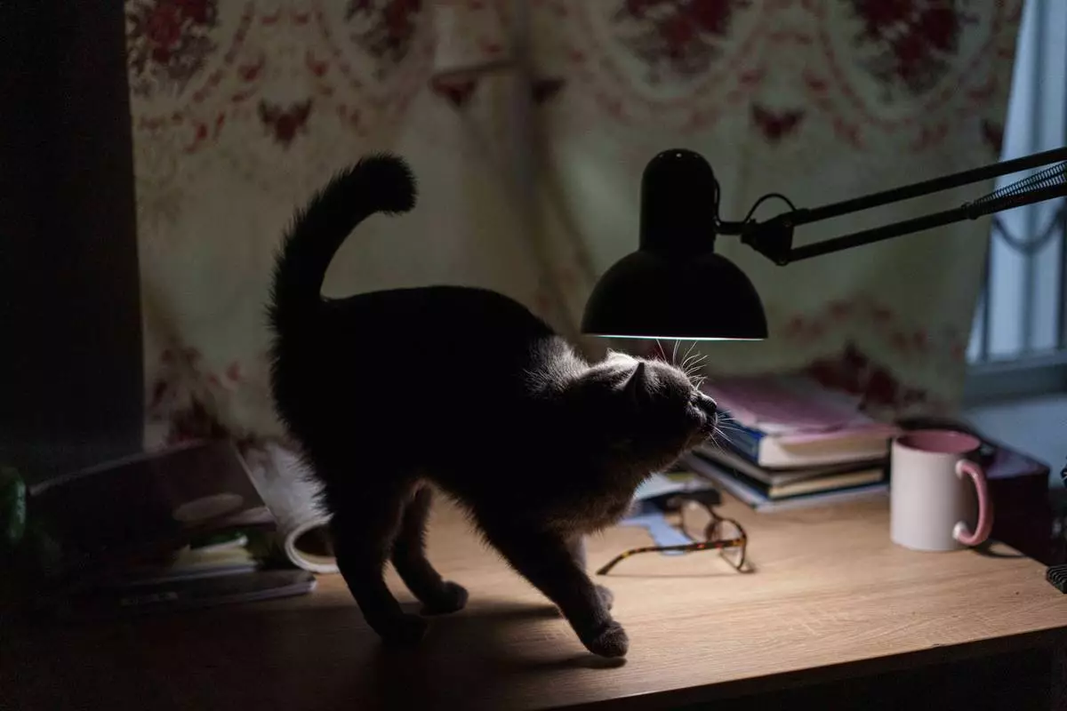 A cat walks on a table at a hostel for displaced people in Dnipro, Ukraine, Wednesday, Oct. 8, 2025. (AP Photo/Evgeniy Maloletka)