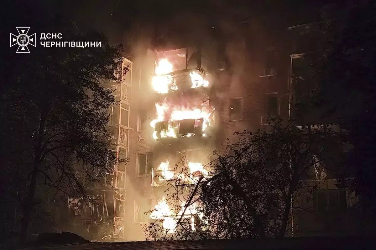 In this photo provided by the Ukrainian Emergency Services on Thursday, Oct. 16, 2025, a residential building is seen on fire after a Russian strike in Nizhyn, Chernihiv region, Ukraine. (Ukrainian Emergency Service via AP)
