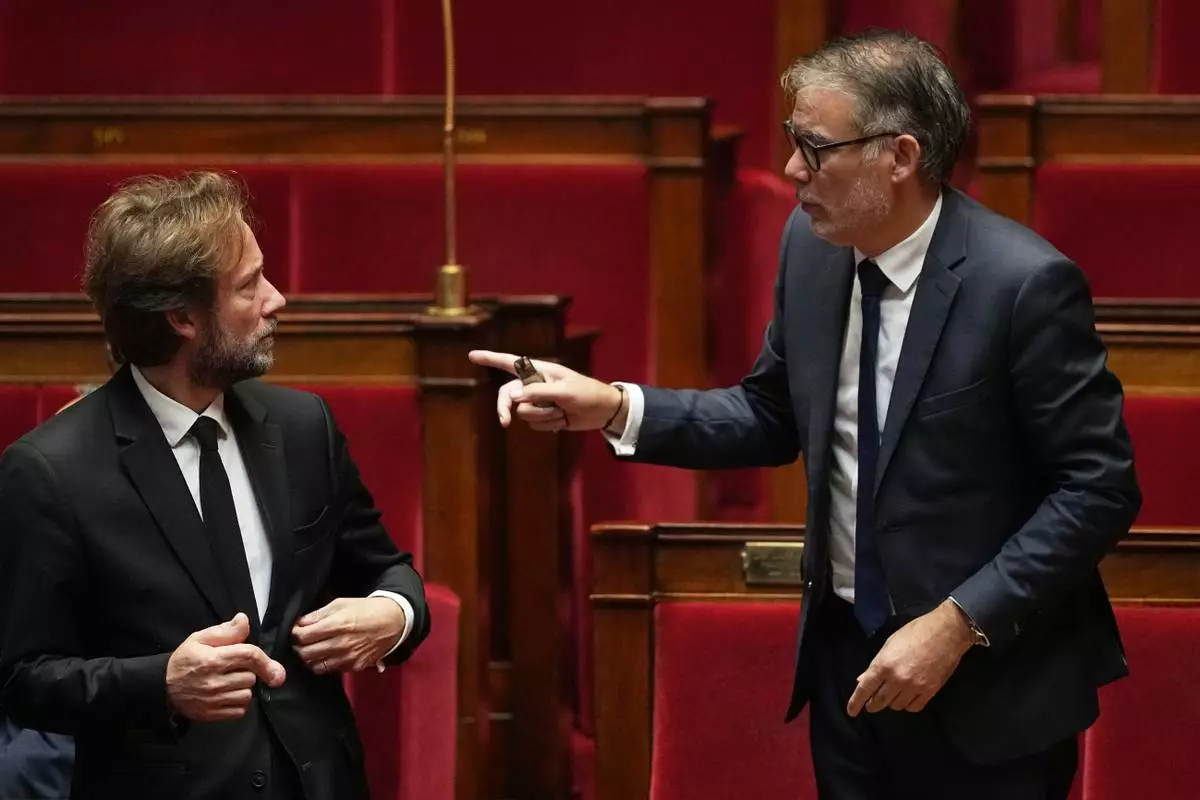 French socialist party general secretary Olivier Faure, right, talks with the president of the Socialist group in the National Assembly Boris Vallaud before a no-confidence vote, Thursday, Oct. 16, 2025 at the National Assembly in Paris. (AP Photo/Thibault Camus)