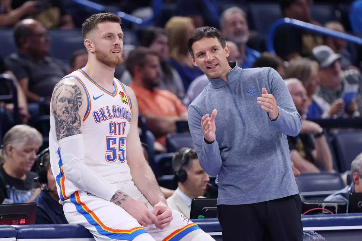 Oklahoma City Thunder head coach Mark Daigneault, right, talks to center Isaiah Hartenstein (55) during the first half of a preseason NBA basketball game against the Charlotte Hornets, Thursday, Oct. 9, 2025, in Oklahoma City. (AP Photo/Nate Billings)
