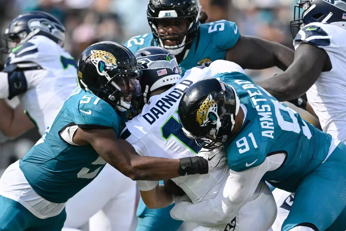 Seattle Seahawks quarterback Sam Darnold (14) is sacked by Jacksonville Jaguars linebacker Ventrell Miller (51) and defensive tackle Arik Armstead (91) during the second half of an NFL football game Sunday, Oct. 12 2025, in Jacksonville, Fla. (AP Photo/Phelan M. Ebenhack)