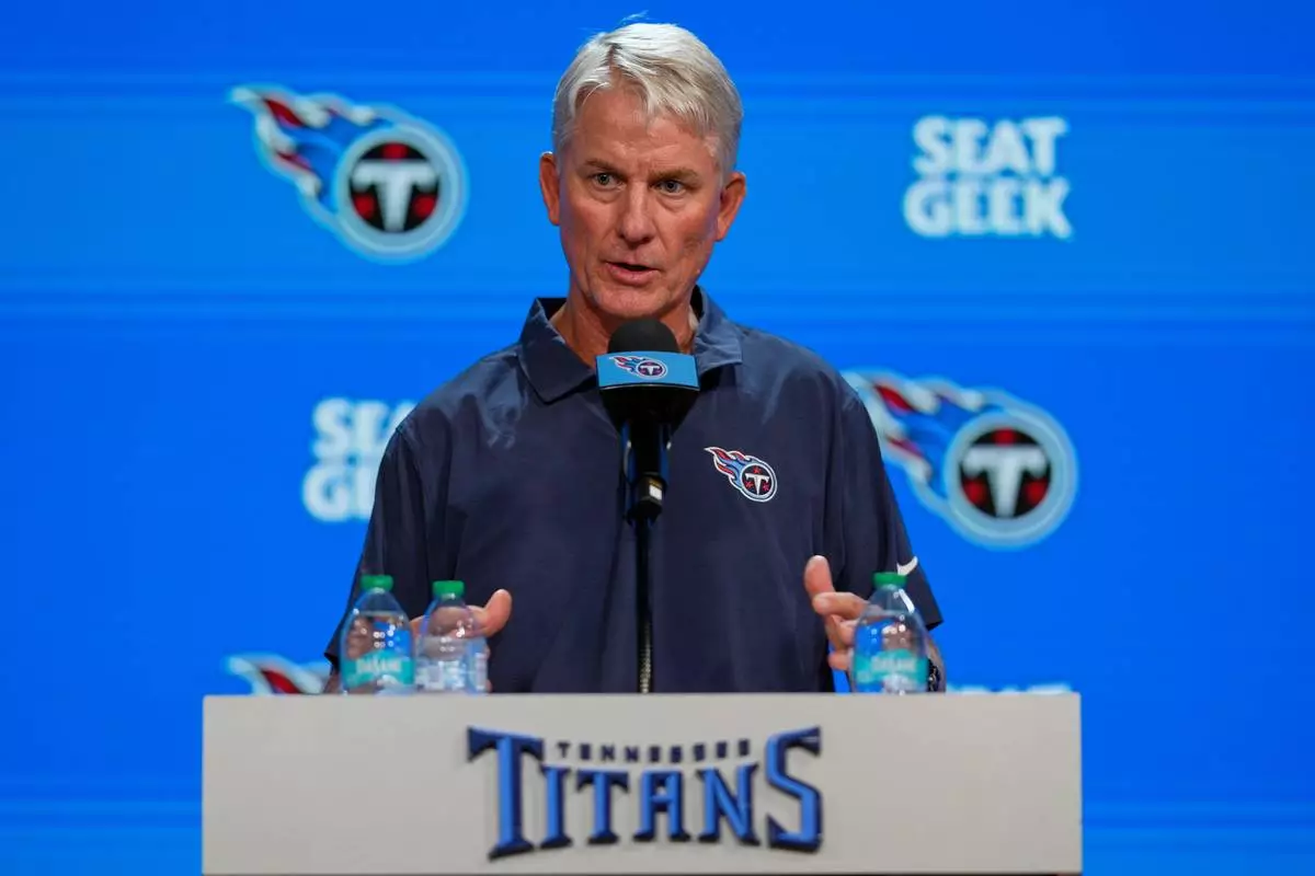 Tennessee Titans interim head coach Mike McCoy speaks during a news conference at the NFL football team's training facility Tuesday, Oct. 14, 2025, in Nashville, Tenn. (AP Photo/George Walker IV)