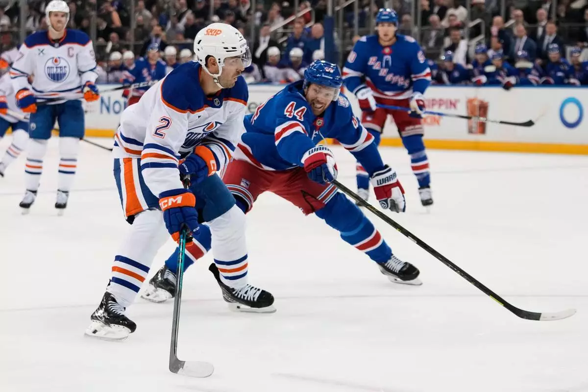 New York Rangers' Vladislav Gavrikov (44) defends Edmonton Oilers' Evan Bouchard (2) during the first period of an NHL hockey game Tuesday, Oct. 14, 2025, in New York. (AP Photo/Frank Franklin II)