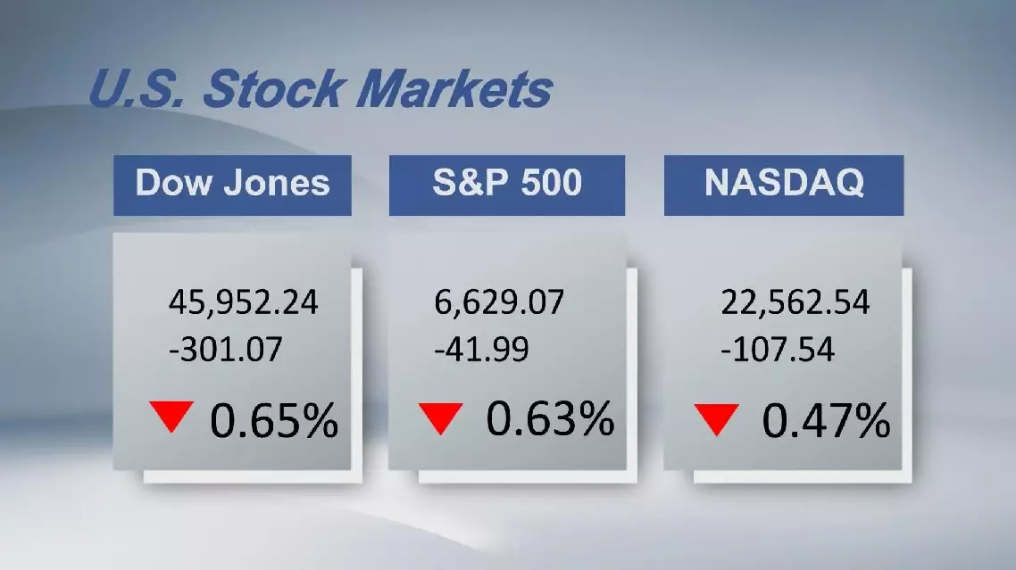 The Dow Jones Industrial Average fell by 301.07 points, or 0.65 percent, to 45,952.24. The S&P 500 sank 41.99 points, or 0.63 percent, to 6,629.07. The Nasdaq Composite Index shed 107.54 points, or 0.47 percent, to 22,562.54.