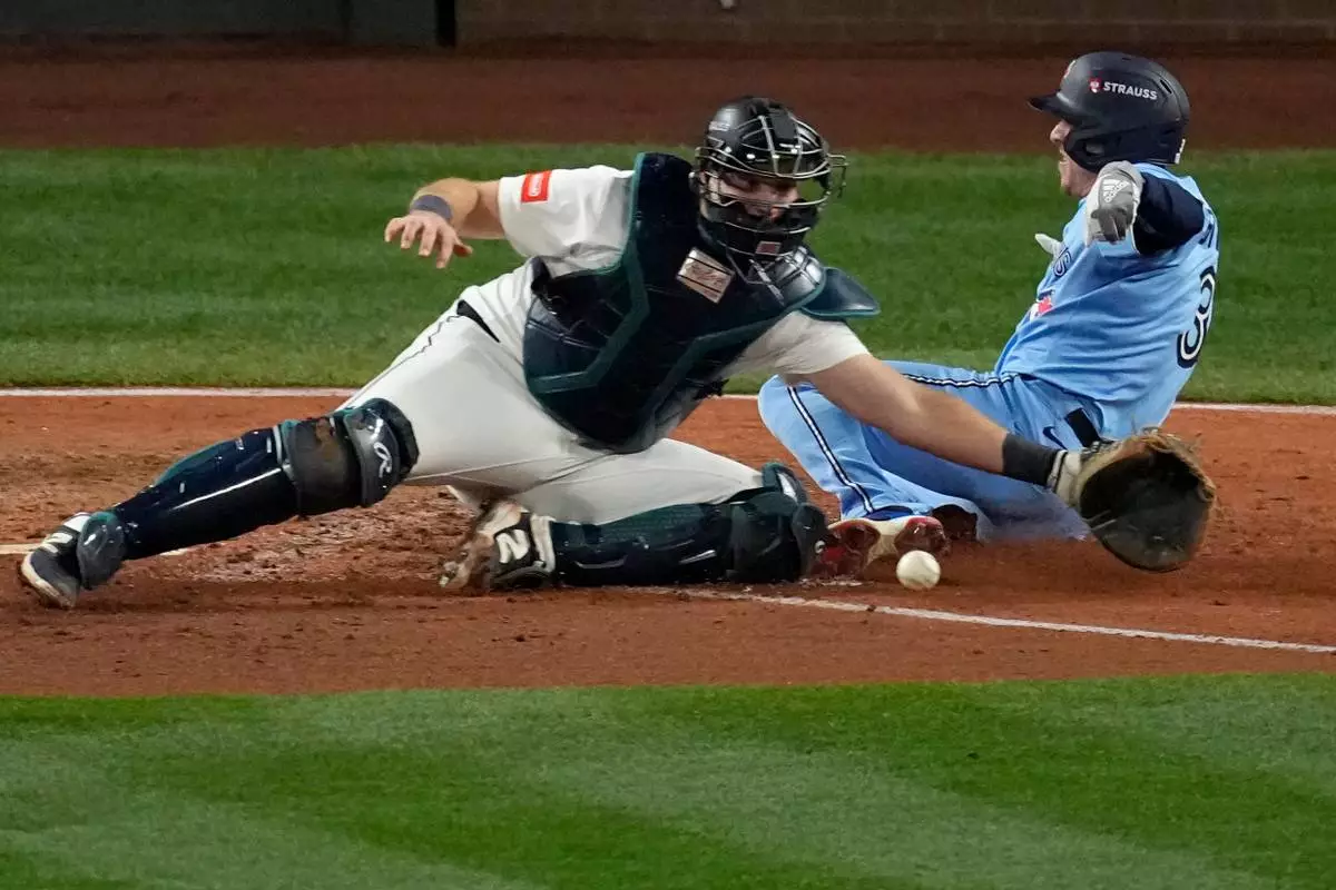 Toronto Blue Jays' Myles Straw scores on a single by Andrés Giménez during the eighth inning in Game 4 of baseball's American League Championship Series as Seattle Mariners catcher Cal Raleigh reaches for the throw, Thursday, Oct. 16, 2025, in Seattle. (AP Photo/David J. Phillip)