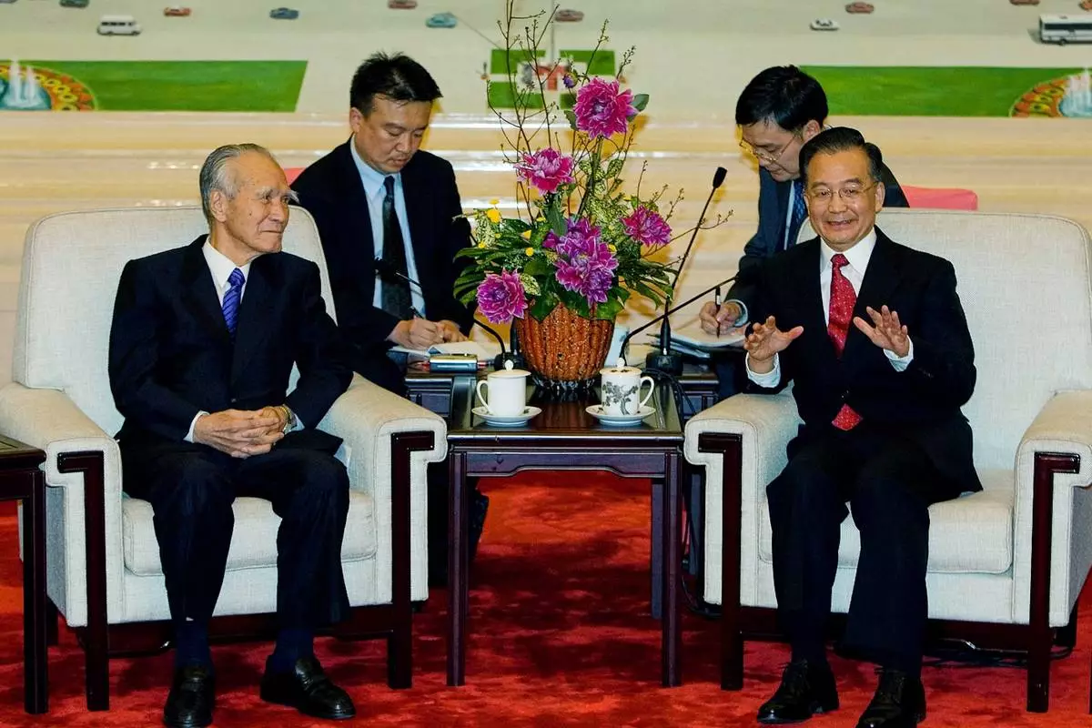 FILE - Chinese Premier Wen Jiabao, right, meets former Japanese Prime Minister Murayama Tomiichi before a banquet to commemorate the 35th anniversary of the normalization of Sino-Japanese relations at the Great Hall of the People on Sept. 27, 2007, in Beijing. (Andrew Wong/Pool Photo via AP, File)