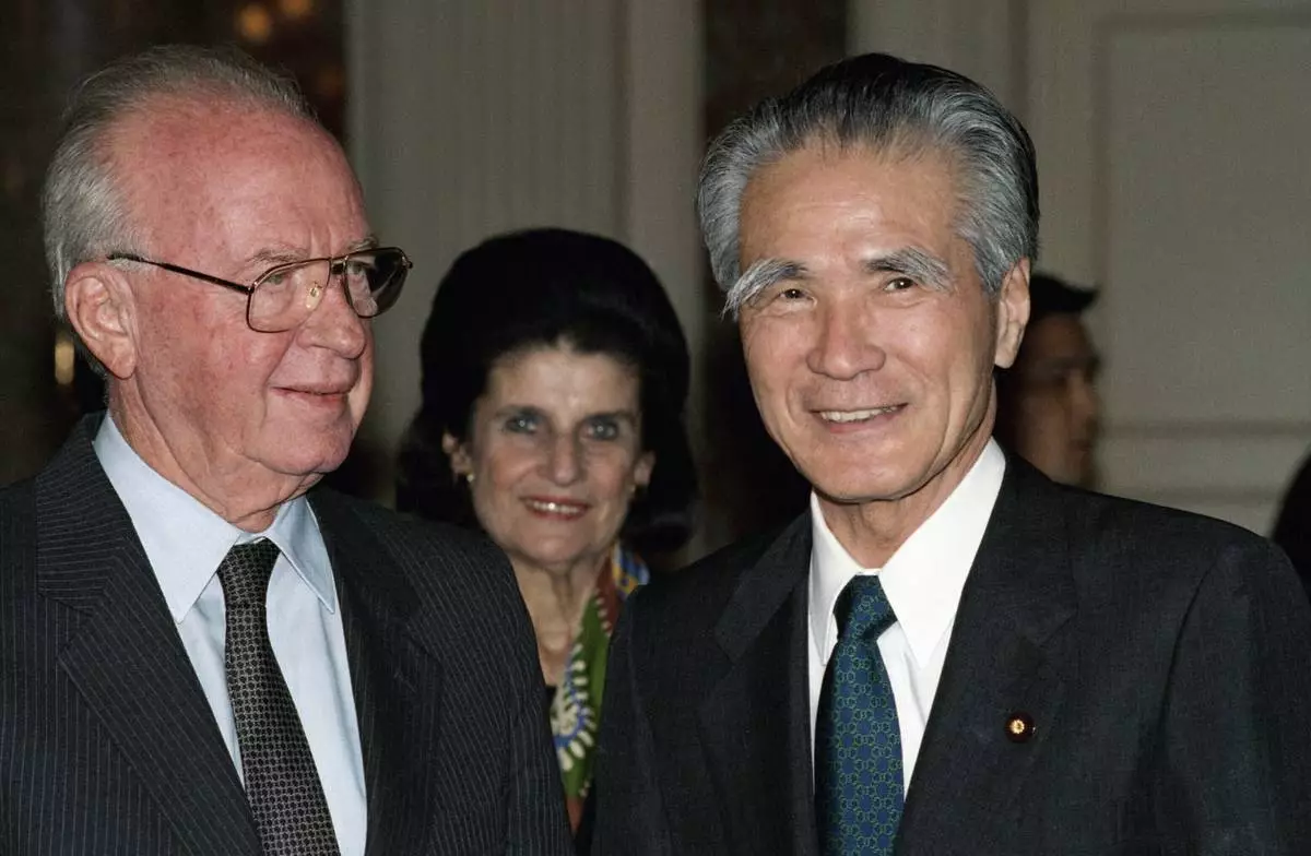 FILE - Israeli Prime Minister Yitzhak Rabin, left, with first lady Leah Rabin, shares a smile with Japanese counterpart Tomiichi Murayama upon his arrival for a welcome ceremony for him on Dec. 12, 1994, at the Akasaka state guest house in Tokyo. (AP Photo/Tsugufumi Matsumoto, Pool, File)