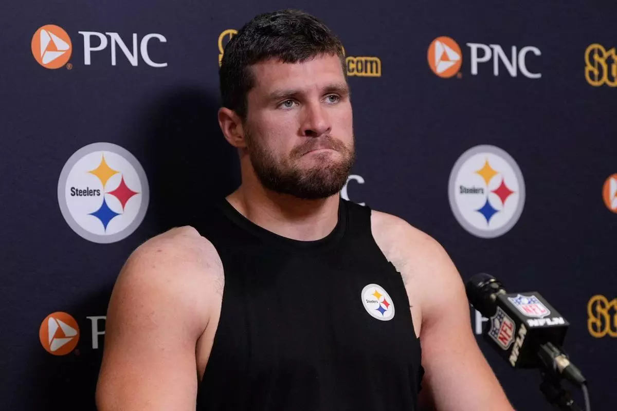 Pittsburgh Steelers outside linebacker T.J. Watt talks with reporters following an NFL football game against the Cincinnati Bengals in Cincinnati Thursday, Oct. 16, 2025. (AP Photo/Carolyn Kaster)