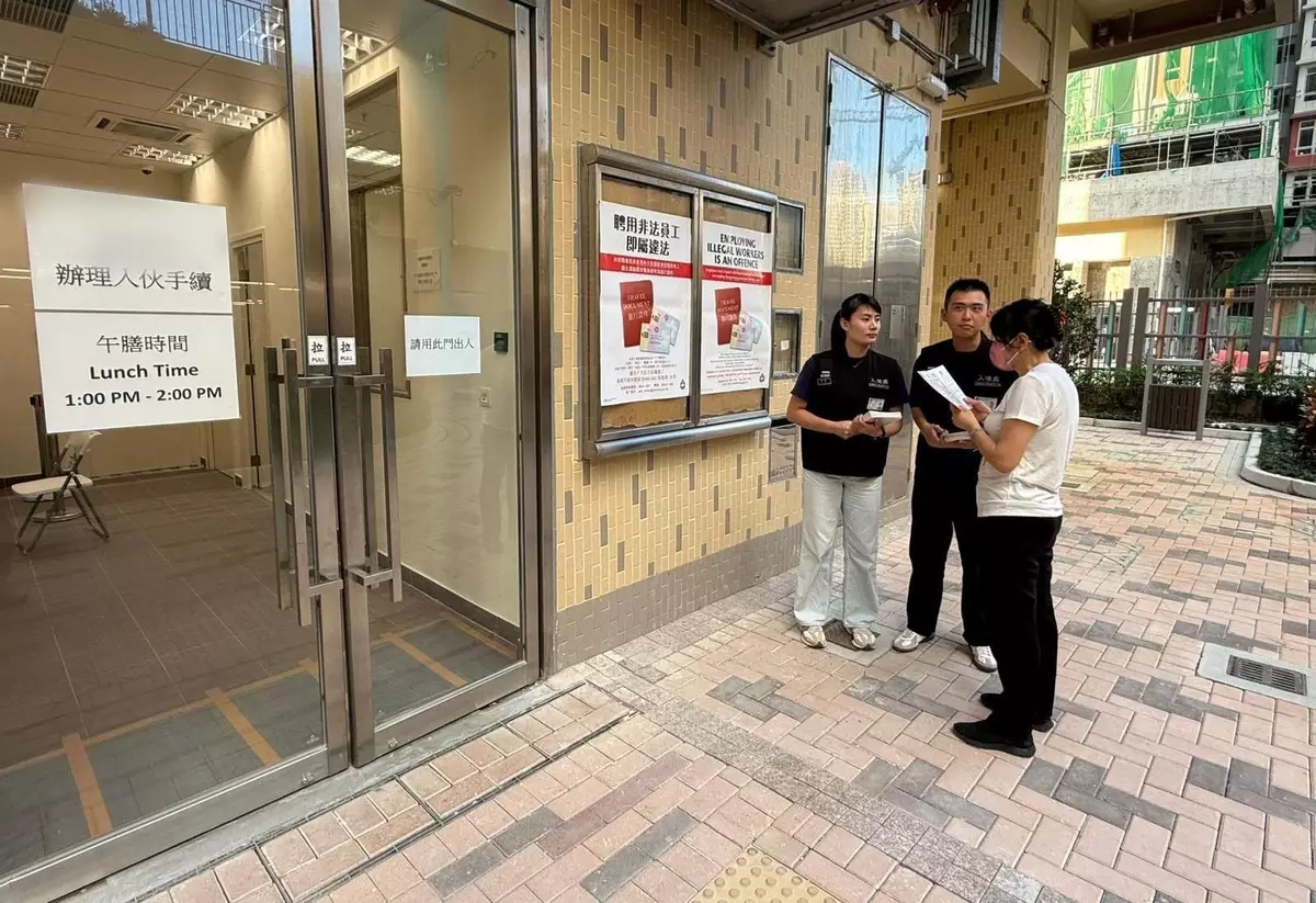 Apart from mounting the enforcement operation, ImmD officers and a promotional vehicle have been deployed to distribute "Don't Employ Illegal Workers" leaflets and convey the message to occupants and property management staffs in newly inhabited housing estates.