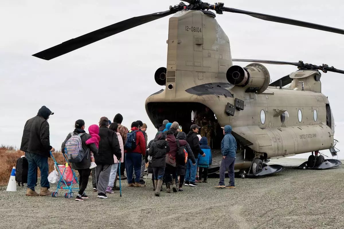 In this photo provided by the Alaska Army National Guard, displaced people are evacuated from Kwigillingok, Alaska, on Thursday, Oct. 16, 2025, following Typhoon Halong that struck Alaska's west coast. (Joseph Moon/Alaska National Guard via AP)