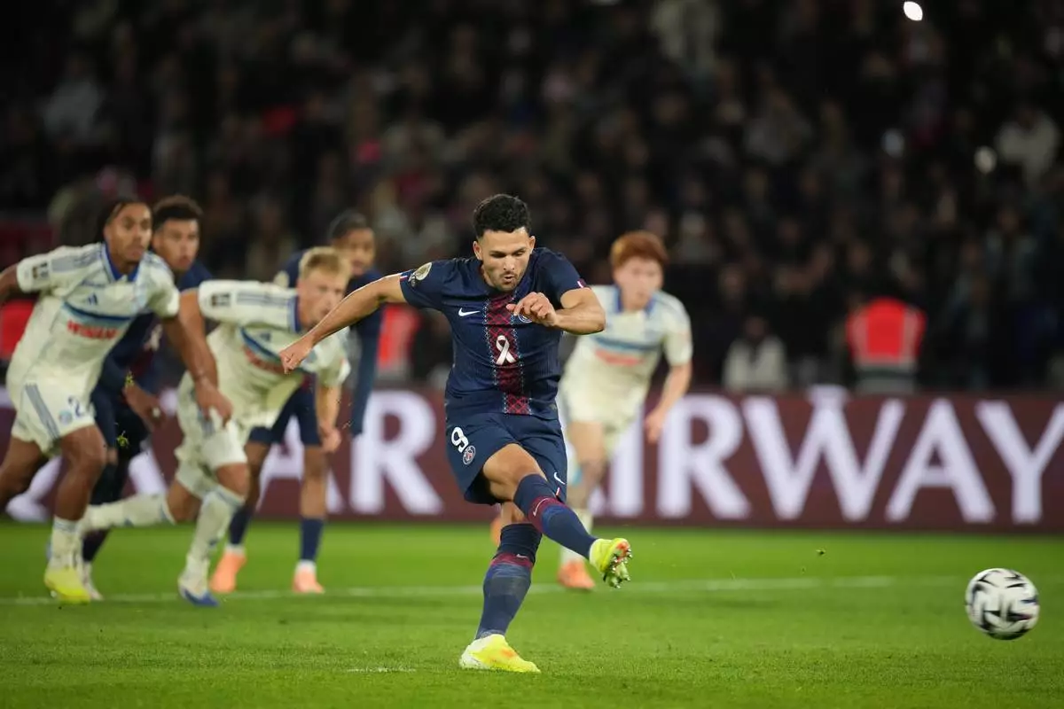 PSG's Goncalo Ramos scores his side's second goal by a penalty during the French League One soccer match between Paris Saint-Germain and Strasbourg, in Paris, France, Friday, Oct. 17, 2025. (AP Photo/Christophe Ena)