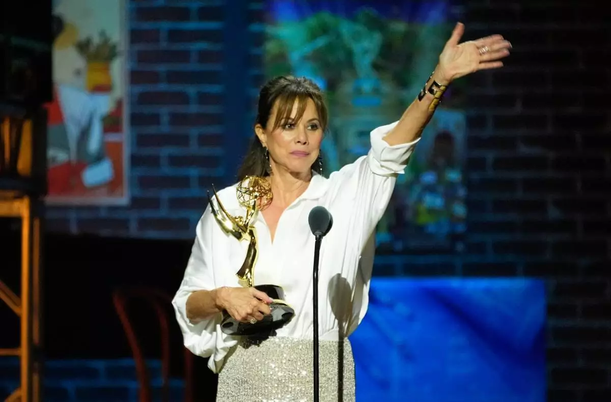 Actor Alley Mills celebrates onstage after winning the award for Outstanding Guest Performance in a Daytime Drama Series for her performance in "General Hospital" during the 52nd Annual Daytime Emmy Awards on Friday, Oct. 17, 2025, at Pasadena Civic Auditorium in Pasadena, Calif. (AP Photo/Chris Pizzello)