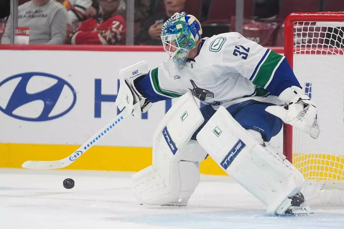 Vancouver Canucks goaltender Kevin Lankinen makes a save against the Chicago Blackhawks during the second period of an NHL hockey game Friday, Oct. 17, 2025, in Chicago. (AP Photo/Erin Hooley)