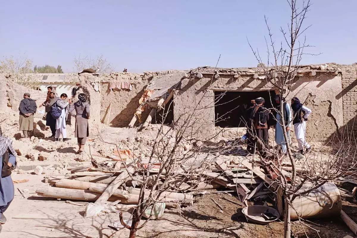 Locals inspect the site of a cross-border attack by the Pakistani army in Afghanistan's eastern Paktika province, Saturday, Oct. 18, 2025. (AP Photo/Shafiqullah Mashaal)